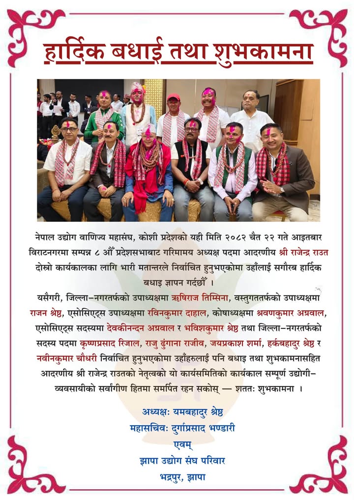झापा । नेपाल उद्योग वाणिज्य महासंघ कोशी प्रदेशको दोस्रो कार्यकालका लागि राजेन्द्र राउत भारी मतान्तरले अध्यक्ष पदमामा निर्वाचित भएका छन्।