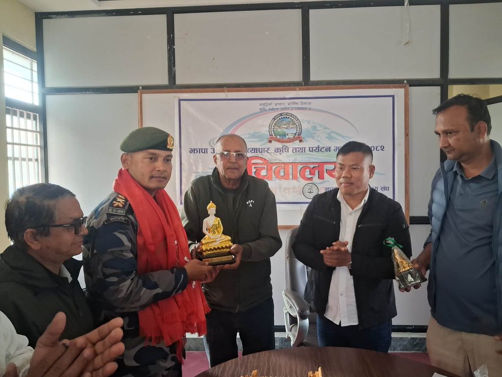 झापा । झापाबाट दंगा नियन्त्रण रेजिमेन्ट गण काठमाडौं सरुवा भएका सशस्त्र प्रहरी बल नं. २ गण हे. क्वा. झापा भद्रपुर प्रमुख सशस्त्र प्रहरी उपरीक्षक तुलबहादुर भण्डारीलाई झापा उद्योग वाणिज्य संघले फेरि भेटौँला कार्यक्रमसहित सम्मान गरेको छ ।